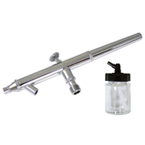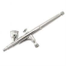 Presenta una combinación de boquilla y aguja de 0,25 mm con 2 cc tamaño copa, convenientes para un pulverizado fino y detallado. Uso perfecto para uñas, belleza, arte y aplicación de ilustración. Control de flujo de color preestablecido en el mango. Doble acción.