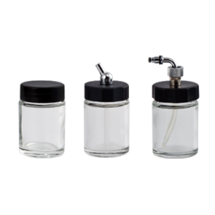 Una variedad de frascos para aerógrafos Sparmax y series GP. Tamaños de 7 cc a 80 cc en cristal o plástico.
